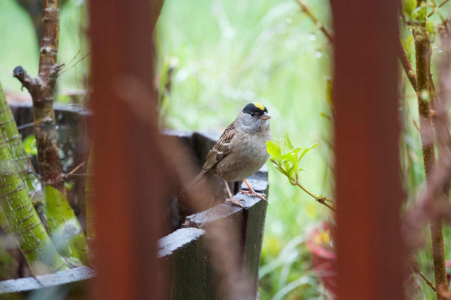 The golden-crowned sparrows are back for the winter, hopping around my yard and singing their little songs, even though they are not currently breeding and they never breed here, preferring the cooler climates of Canada and Alaska during their breeding season. It is funny; I consider Oregon to be quite north, but to the golden-crowned sparrows, Portland, Oregon, is the “south” for the winter.